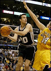 La presencia de Ginóbili, junto con la de Speedy Claxton, cambió por completo la marcha del partido en el cuarto periodo cuando el jugador argentino le robó con elegancia y limpieza un balón a Bryant, capturó un rebote defensivo y logró una canasta con penetración y giro de espaldas que puso a los seguidores de los Lakers en el dilema de hacer algún tipo de exclamación o aplaudir.