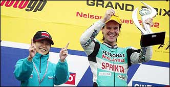 Sebastián Porto, en lo más alto del podio de Río de Janeiro, en compañía de la malaya Janei Looi, Team Manager del equipo en el que corre el piloto argentino: Petronas Sprinta Yamaha TVK
