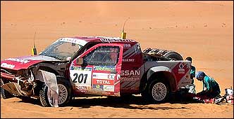 El vehículo que pilotaban fue víctima de un "accidente serio" tras volar sobre una duna a la altura del kilómetro 373 de la etapa del jueves, la más larga del rally con salida en la localidad libia de Ghat y con 727 kilómetros de recorrido.