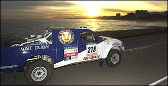 El piloto Khali Al Mutaiwei y su copiloto, Philippe Monnet, con Nissan, a su paso por la playa de Benicasim antes de llegar a Castellon a donde el jueves llegó la caravana del Dakar 2003 antes de su salida hacia Africa