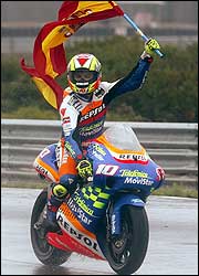 El español Alfonso "Fonsi" González Nieto recortó diferencias respecto al italiano Marco Melandri al vencerle en un infernal G.P. de Portugal de 250; el argentino Sebastián Porto finalizó tercero