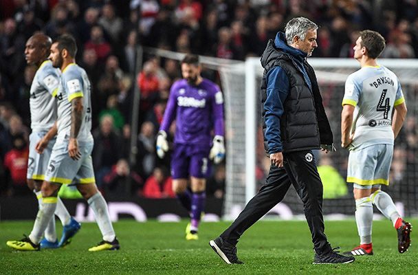 Poco tiempo después, en Old Trafford, el Teatro de los Sueños, el estadio donde Manchester United celebra sus 20 títulos de liga y 12 FA Cups, Mourinho observa a sus jugadores anotar un gol temprano en partido de la Copa de Liga contra el Derby County, de segunda división. Mira a su exjugador Frank Lampard, quien ahora dirige al Derby, guiar a los desfavorecidos visitantes hacia el empate y de repente, inesperadamente, irse al frente por un gol. Cuando Manchester United anota un improbable gol de igualar el marcador en los minutos extra del segundo tiempo, Mourinho levanta el puño desde las líneas.