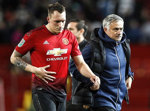 La forma en que José Mourinho trató a Phil Jones, a la izquierda, después de su derrota en la Copa Carabao contra Derby fue más allá de su habitual forma de criticar públicamente a sus jugadores. Martin Rickett/PA Wire/AP Photo