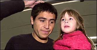 Juan Román Riquelme, junto a su hija en el aeropuerto de Ezeiza, se dispone a emprender viaje a España, donde se sumará al Barcelona de Louis van Gaal
