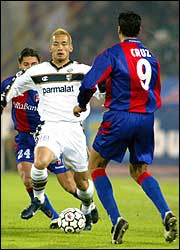 El japonés Hidetoshi Nakata, del Parma, se encuentra frente a frente con el argentino Julio Cruz, que marcaría los dos goles en la victoria del Bologna