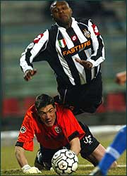 El uruguayo Marcelo Zalayeta salta por encima del arquero del Como Marco Brunner; la Juventus sigue firme en la punta