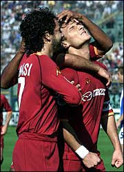 FESTEJO. Totti es abrazado por Tomassi luego de su gol ante la Brescia. Con la victoria la Roma logra un poco de aire tras un flojo comienzo. (Reuters)