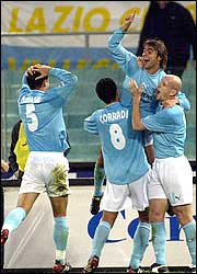 De izquierda a derecha, Dejan Stankovic, Bernardo Corradi y Jaap Stam felicitan a Claudio López, autor de uno de los goels en la victoria de la Lazio, que ya llegó al tercer lugar