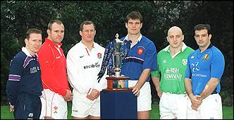 De derecha a izquierda, Andy Nichol (Escocia), Scott Quinell (Gales), Richard Hill (Inglaterra), Fabien Pelous (Francia), Keith Wood (Irlanda) y Alessandro Moscardi (Italia) posan con la copa