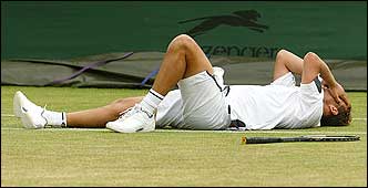 En la quinta, la seguridad y el acierto de Nalbandián para quebrar al inicio fueron definitivas y tras confirmar su triunfo, David lanzó su raqueta, se revolcó en la hierba y corrió a abrazar a su técnico.