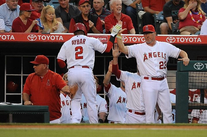 ANAHEIM, CA - JULY 21: Erick Aybar #2 of the Los Angeles Angels of Anaheim celebrates with Pitching Coach Mike Butcher #23 after scoring on an RBI single hit by Chris Iannetta #17 (not pictured) at the bottom of the second inning during a game against the Minnesota Twins at Angel Stadium of Anaheim on July 21, 2015 in Anaheim, California. (Photo by Jonathan Moore/Getty Images)