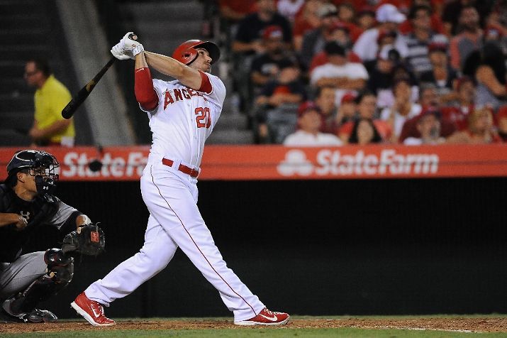 ANAHEIM, CA - JULY 21: Matt Joyce #20 of the Los Angeles Angels of Anaheim follows through on a sacrafice fly at the bottom of the fifth inning during a game against the Minnesota Twins at Angel Stadium of Anaheim on July 21, 2015 in Anaheim, California. (Photo by Jonathan Moore/Getty Images)