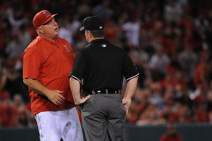 ANAHEIM, CA - JULY 21: Manager Mike Scioscia #14 of the Los Angeles Angels of Anaheim argues with an official over an interference call after Eduardo Escobar #5 of the Minnesota Twins (not pictured) got in the way of Erick Aybar #2 (not pictured) in the fifth inning during a game at Angel Stadium of Anaheim on July 21, 2015 in Anaheim, California. (Photo by Jonathan Moore/Getty Images)