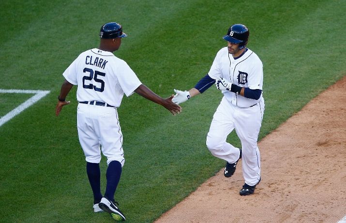 DETROIT, MI - JULY 21: J.D. Martinez #28 of the Detroit Tigers celebrates with third base coach Dave Clark #25 of the after hitting a two run home run in the third inning of the game against the Seattle Mariners on July 21, 2015 at Comerica Park in Detroit, Michigan. (Photo by Leon Halip/Getty Images)