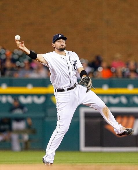 DETROIT, MI - JULY 21: Nick Castellanos #9 of the Detroit Tigers makes the long throw to first base on the infield single by Mark Trumbo #35 of the Seattle Mariners (not in photo) during the seventh inning of the game on July 21, 2015 at Comerica Park in Detroit, Michigan. (Photo by Leon Halip/Getty Images)