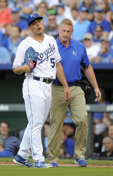 KANSAS CITY, MO - JULY 21: Starting pitcher Jason Vargas #51 of the Kansas City Royals is looked after by a team trainer after he injured himself throwing against the Pittsburgh Pirates in the second inning at Kauffman Stadium on July 21, 2015 in Kansas City, Missouri. (Photo by Ed Zurga/Getty Images)