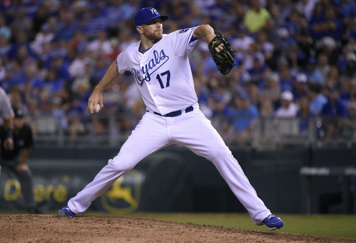 KANSAS CITY, MO - JULY 21: Wade Davis #17 of the Kansas City Royals throws in the eighth inning against the Pittsburgh Pirates at Kauffman Stadium on July 21, 2015 in Kansas City, Missouri. (Photo by Ed Zurga/Getty Images)