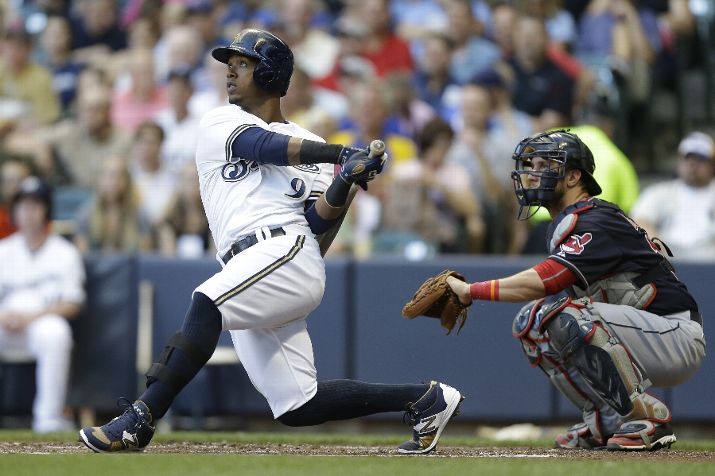MILWAUKEE, WI - JULY 21: Jean Segura #9 of the Milwaukee Brewers hits a two run homer in the second inning against the Cleveland Indians during the Interleague game at Miller Park on July 21, 2015 in Milwaukee, Wisconsin. (Photo by Mike McGinnis/Getty Images)