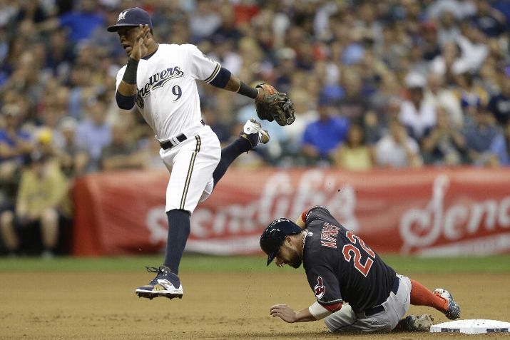 MILWAUKEE, WI - JULY 21: Jean Segura #9 of the Milwaukee Brewers jumps over Jason Kipnis #22 of the Cleveland Indians while turning the double play during the fifth inning of the Interleague game at Miller Park on July 21, 2015 in Milwaukee, Wisconsin. (Photo by Mike McGinnis/Getty Images)