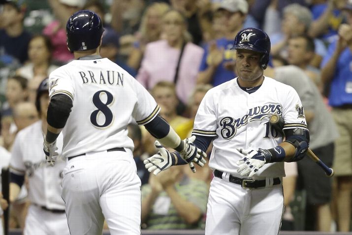 MILWAUKEE, WI - JULY 21: Ryan Braun #8 of the Milwaukee Brewers celebrates with Aramis Ramirez #16 after reaching on a Rbi single hit Carlos Gomez in the seventh inning of the Cleveland Indians during the Interleague game at Miller Park on July 21, 2015 in Milwaukee, Wisconsin. (Photo by Mike McGinnis/Getty Images)