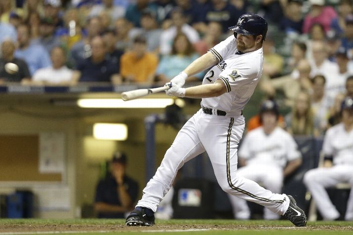 MILWAUKEE, WI - JULY 21: Adam Lind #24 of the Milwaukee Brewers hits a RBI single in the seventh inning against the Cleveland Indians during the Interleague game at Miller Park on July 21, 2015 in Milwaukee, Wisconsin. (Photo by Mike McGinnis/Getty Images)
