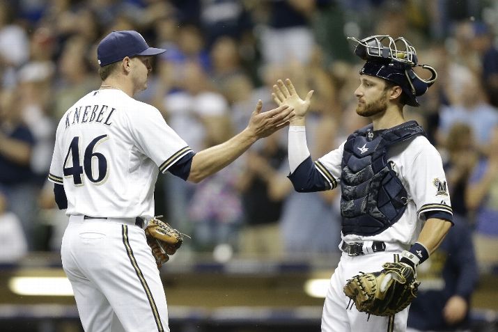 MILWAUKEE, WI - JULY 21: Corey Knebel #46 of the Milwaukee Brewers celebrates with Jonathan Lucroy #20 after the 8-1 win against the Cleveland Indians during the Interleague game at Miller Park on July 21, 2015 in Milwaukee, Wisconsin. (Photo by Mike McGinnis/Getty Images)