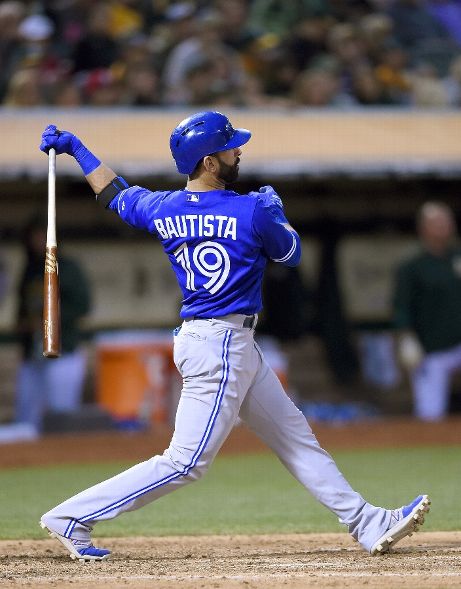 OAKLAND, CA - JULY 21: Jose Bautista #19 of the Toronto Blue Jays swings and watches the flight of his ball as he hits a solo home run against the Oakland Athletics in the top of the sixth inning at O.co Coliseum on July 21, 2015 in Oakland, California. (Photo by Thearon W. Henderson/Getty Images)