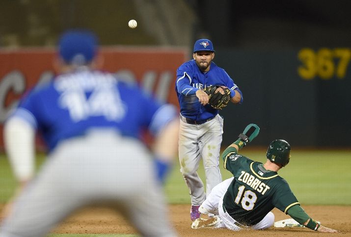 OAKLAND, CA - JULY 21: Devon Travis #29 of the Toronto Blue Jays gets his throw off to complete the double-play over the top of Ben Zobrist #18 of the Oakland Athletics in the bottom of the eighth inning at O.co Coliseum on July 21, 2015 in Oakland, California. The Blue Jays won the game 7-1. (Photo by Thearon W. Henderson/Getty Images)