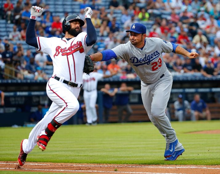ATLANTA, GA - JULY 21: Nick Markakis #22 of the Atlanta Braves is tagged out by Adrian Gonzalez #23 of the Los Angeles Dodgers as Jace Peterson #8 scores in the first inning at Turner Field on July 21, 2015 in Atlanta, Georgia. (Photo by Kevin C. Cox/Getty Images)