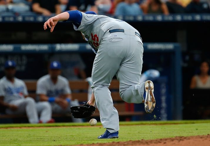 ATLANTA, GA - JULY 21: Brett Anderson #35 of the Los Angeles Dodgers fails to make a play on this grounder hit by Jonny Gomes #7 of the Atlanta Braves in the third inning at Turner Field on July 21, 2015 in Atlanta, Georgia. (Photo by Kevin C. Cox/Getty Images)