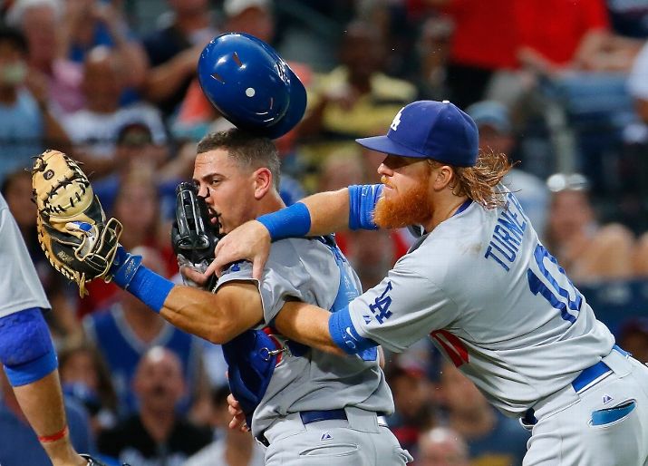 ATLANTA, GA - JULY 21: Justin Turner #10 collides with Austin Barnes #65 of the Los Angeles Dodgers as Barnes catches a pop-up by Ryan Lavarnway #30 of the Atlanta Braves in the fourth inning at Turner Field on July 21, 2015 in Atlanta, Georgia. (Photo by Kevin C. Cox/Getty Images) ***BESTPIX***
