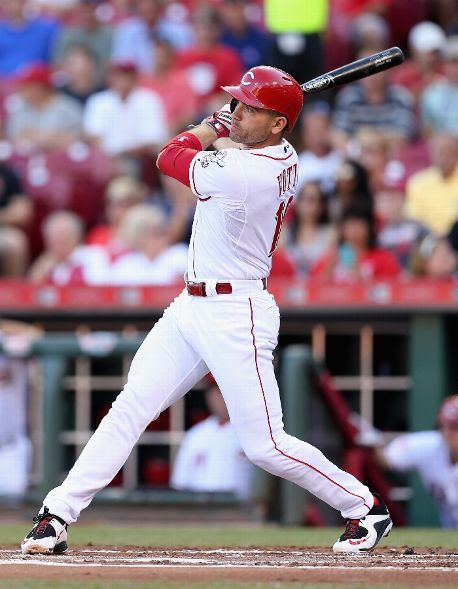 CINCINNATI, OH - JULY 21: Joey Votto #19 of the Cincinnati Reds hits a ball that would be dropped for an error and wind up on firstbase against the Chicago Cubs at Great American Ball Park on July 21, 2015 in Cincinnati, Ohio. (Photo by Andy Lyons/Getty Images)