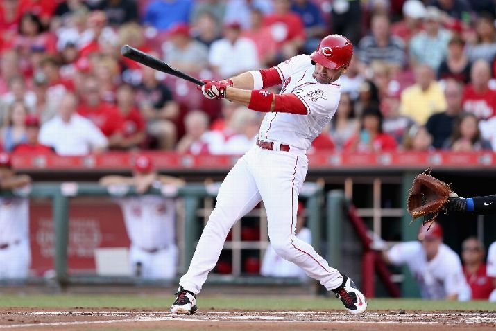 CINCINNATI, OH - JULY 21: Joey Votto #19 of the Cincinnati Reds hits a ball that would be dropped for an error and wind up on firstbase against the Chicago Cubs at Great American Ball Park on July 21, 2015 in Cincinnati, Ohio. (Photo by Andy Lyons/Getty Images)