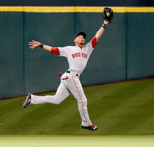 HOUSTON, TX - JULY 21: Mookie Betts #50 of the Boston Red Sox makes a running catch on a fly ball by Carlos Correa #1 of the Houston Astros in the first inning at Minute Maid Park on July 21, 2015 in Houston, Texas. (Photo by Bob Levey/Getty Images)