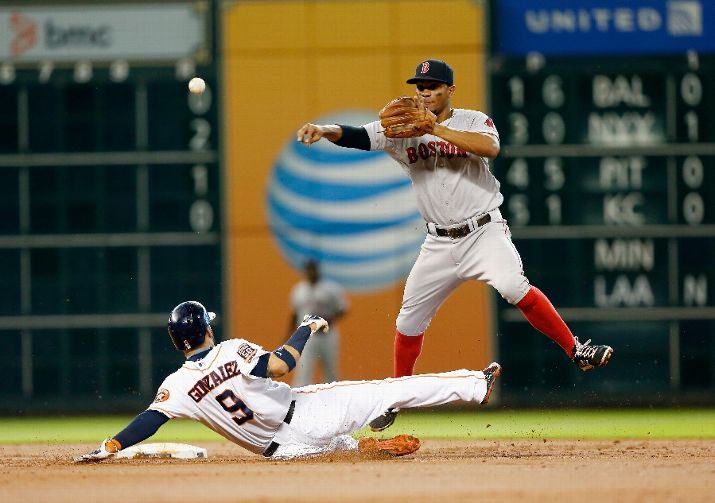 HOUSTON, TX - JULY 21: Xander Bogaerts #2 of the Boston Red Sox throws over a sliding Marwin Gonzalez #9 of the Houston Astros to complete a double play in the first inning at Minute Maid Park on July 21, 2015 in Houston, Texas. (Photo by Bob Levey/Getty Images)