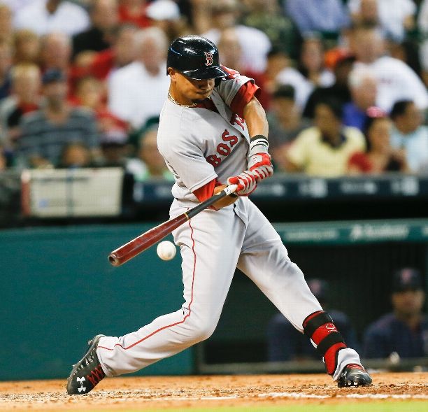 HOUSTON, TX - JULY 21: Mookie Betts #50 of the Boston Red Sox hits a check swing double down the right field line scoring two runs in the third inning against the Houston Astros at Minute Maid Park on July 21, 2015 in Houston, Texas. (Photo by Bob Levey/Getty Images)
