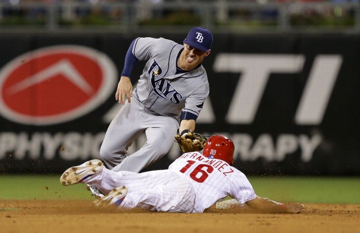 PHILADELPHIA, PA - JULY 21: Jake Elmore #10 of the Tampa Bay Rays tags out Cesar Hernandez #16 of the Philadelphia Phillies on a stolen base attempt in the sixth inning during a game at Citizens Bank Park on July 21, 2015 in Philadelphia, Pennsylvania. The Rays won 1-0. (Photo by Hunter Martin/Getty Images)