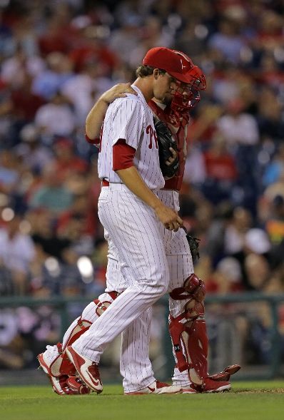 PHILADELPHIA, PA - JULY 21: Cameron Rupp #29 of the Philadelphia Phillies speaks with starting pitcher Aaron Nola #27 in the sixth inning during a game against the Tampa Bay Rays at Citizens Bank Park on July 21, 2015 in Philadelphia, Pennsylvania. The Rays won 1-0. (Photo by Hunter Martin/Getty Images)