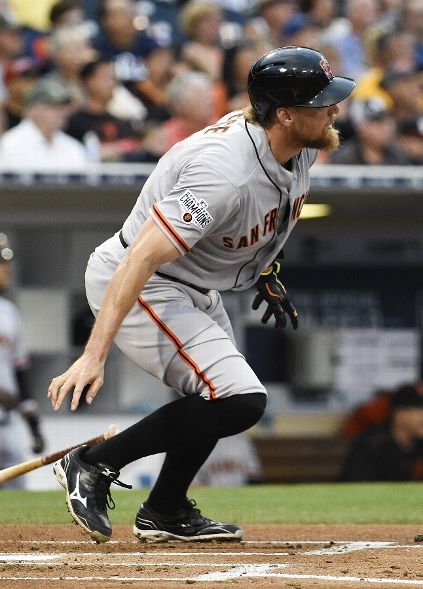 SAN DIEGO, CA - JULY 21: Hunter Pence #8 of the San Francisco Giants hits a solo home run during the second inning of a baseball game against the San Diego Padres at Petco Park July 21, 2015 in San Diego, California. (Photo by Denis Poroy/Getty Images)