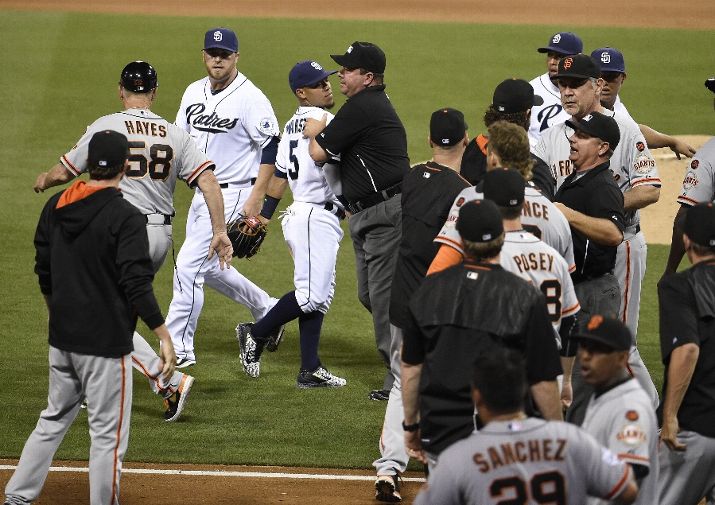 SAN DIEGO, CA - JULY 21: Umpires try to break up a dispute between San Diego Padres playes and San Francisco Giants players during the ninth inning of a baseball game at Petco Park July 21, 2015 in San Diego, California. (Photo by Denis Poroy/Getty Images)