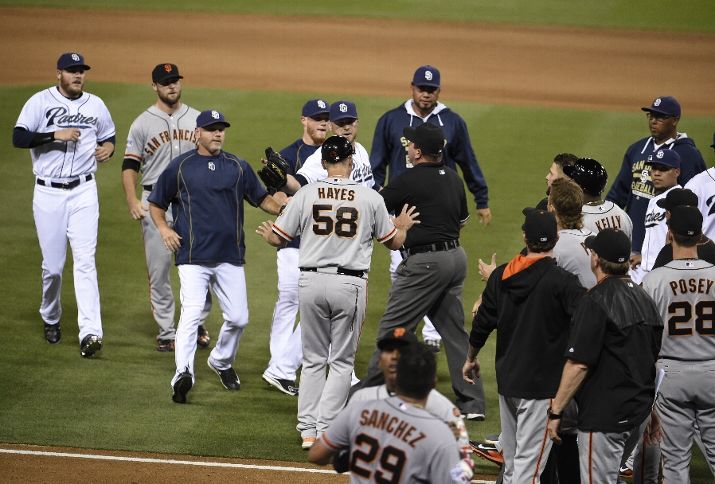 SAN DIEGO, CA - JULY 21: An umpire tries to break up a dispute between San Diego Padres playes and San Francisco Giants players during the ninth inning of a baseball game at Petco Park July 21, 2015 in San Diego, California. (Photo by Denis Poroy/Getty Images)