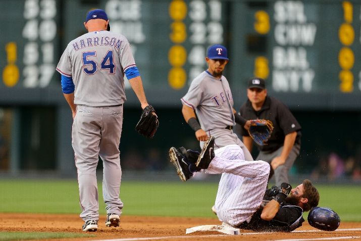 DENVER, CO - JULY 21: Charlie Blackmon #19 of the Colorado Rockies tumbles on the ground after making it safely to first base for an infield single as Matt Harrison #54 of the Texas Rangers and Rougned Odor #12 look on during Interleague play at Coors Field on July 21, 2015 in Denver, Colorado. (Photo by Justin Edmonds/Getty Images)
