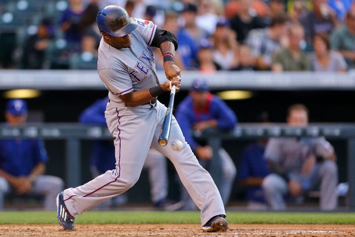 DENVER, CO - JULY 21: Delino DeShields #7 of the Texas Rangers hits a two RBI single in the second inning against the Colorado Rockies during Interleague play at Coors Field on July 21, 2015 in Denver, Colorado. (Photo by Justin Edmonds/Getty Images)