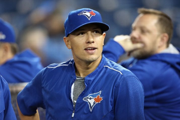 TORONTO, ON - OCTOBER 20: Ryan Goins #17 of the Toronto Blue Jays looks on prior to game four of the American League Championship Series between the Toronto Blue Jays and the Kansas City Royals at Rogers Centre on October 20, 2015 in Toronto, Canada. (Photo by Tom Szczerbowski/Getty Images)