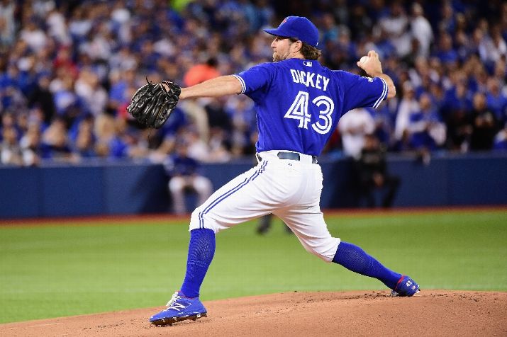 TORONTO, ON - OCTOBER 20: R.A. Dickey #43 of the Toronto Blue Jays throws a pitch in the first inning against the Kansas City Royals during game four of the American League Championship Series at Rogers Centre on October 20, 2015 in Toronto, Canada. (Photo by Harry How/Getty Images)