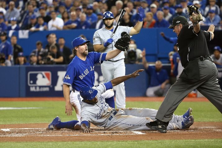 TORONTO, ON - OCTOBER 20: Lorenzo Cain #6 of the Kansas City Royals scores a run in the first inning after R.A. Dickey #43 of the Toronto Blue Jays attempts to make the tag during game four of the American League Championship Series at Rogers Centre on October 20, 2015 in Toronto, Canada. (Photo by Tom Szczerbowski/Getty Images) *** BESTPIX ***