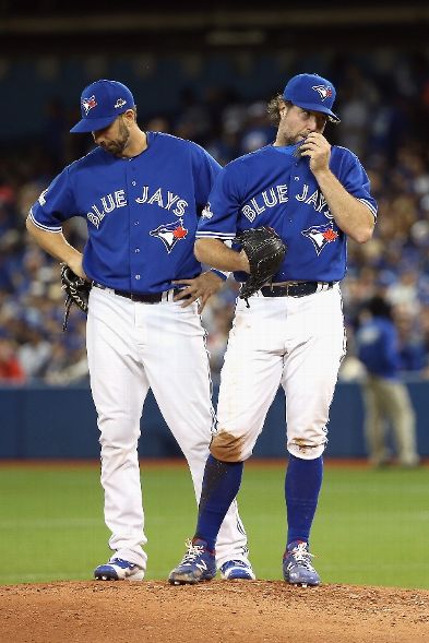 TORONTO, ON - OCTOBER 20: Chris Colabello #15 of the Toronto Blue Jays and R.A. Dickey #43 of the Toronto Blue Jays wait on the pitcher's mound for manager John Gibbons #5 of the Toronto Blue Jays (not pictured) to make a pitching change in the second inning against the Kansas City Royals during game four of the American League Championship Series at Rogers Centre on October 20, 2015 in Toronto, Canada. (Photo by Tom Szczerbowski/Getty Images)
