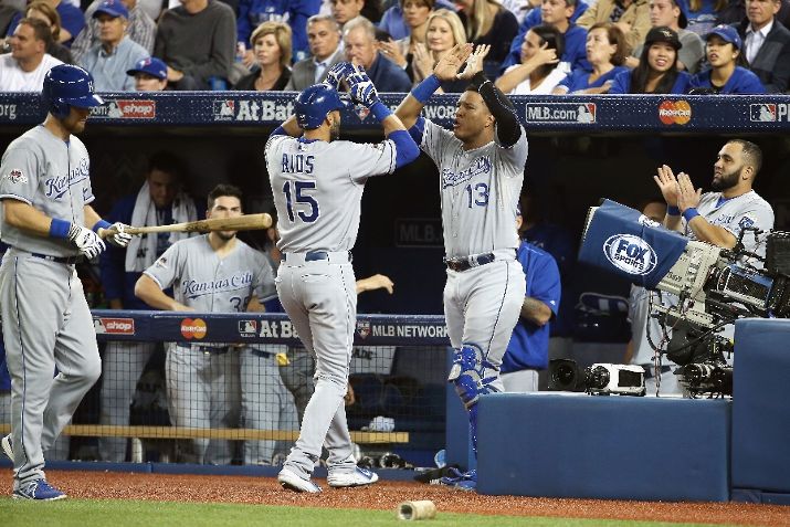 TORONTO, ON - OCTOBER 20: Alex Rios #15 of the Kansas City Royals celebrates with Salvador Perez #13 of the Kansas City Royals after hitting a solo home run in the second inning against the Toronto Blue Jays during game four of the American League Championship Series at Rogers Centre on October 20, 2015 in Toronto, Canada. (Photo by Tom Szczerbowski/Getty Images)