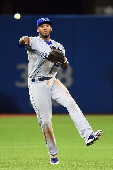 TORONTO, ON - OCTOBER 20: Alcides Escobar #2 of the Kansas City Royals throws out Chris Colabello #15 of the Toronto Blue Jays (not pictured) in the second inning during game four of the American League Championship Series between the Toronto Blue Jays and the Kansas City Royals at Rogers Centre on October 20, 2015 in Toronto, Canada. (Photo by Harry How/Getty Images)