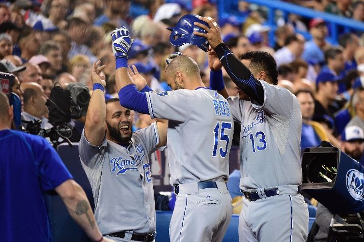 TORONTO, ON - OCTOBER 20: Alex Rios #15 of the Kansas City Royals celebrates with Kendrys Morales #25 of the Kansas City Royals and Salvador Perez #13 of the Kansas City Royals after hitting a solo home run in the second inning against the Toronto Blue Jays during game four of the American League Championship Series at Rogers Centre on October 20, 2015 in Toronto, Canada. (Photo by Harry How/Getty Images)